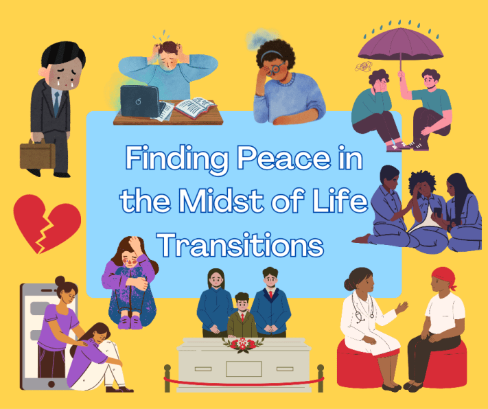 I don’t know what life transitions you are having to adjust to. It may be dealing with life after loss: whether it be the death of a loved one, loss of a job, or a relationship ending. It could be a change in marital status going from single to married or married to divorced. You may be entering into parenthood preparing for the birth of your first child. You could be taking on the responsibility of caregiver for your elderly parent(s). Or you may find yourself relocating for a job opportunity moving away from your family and friends.